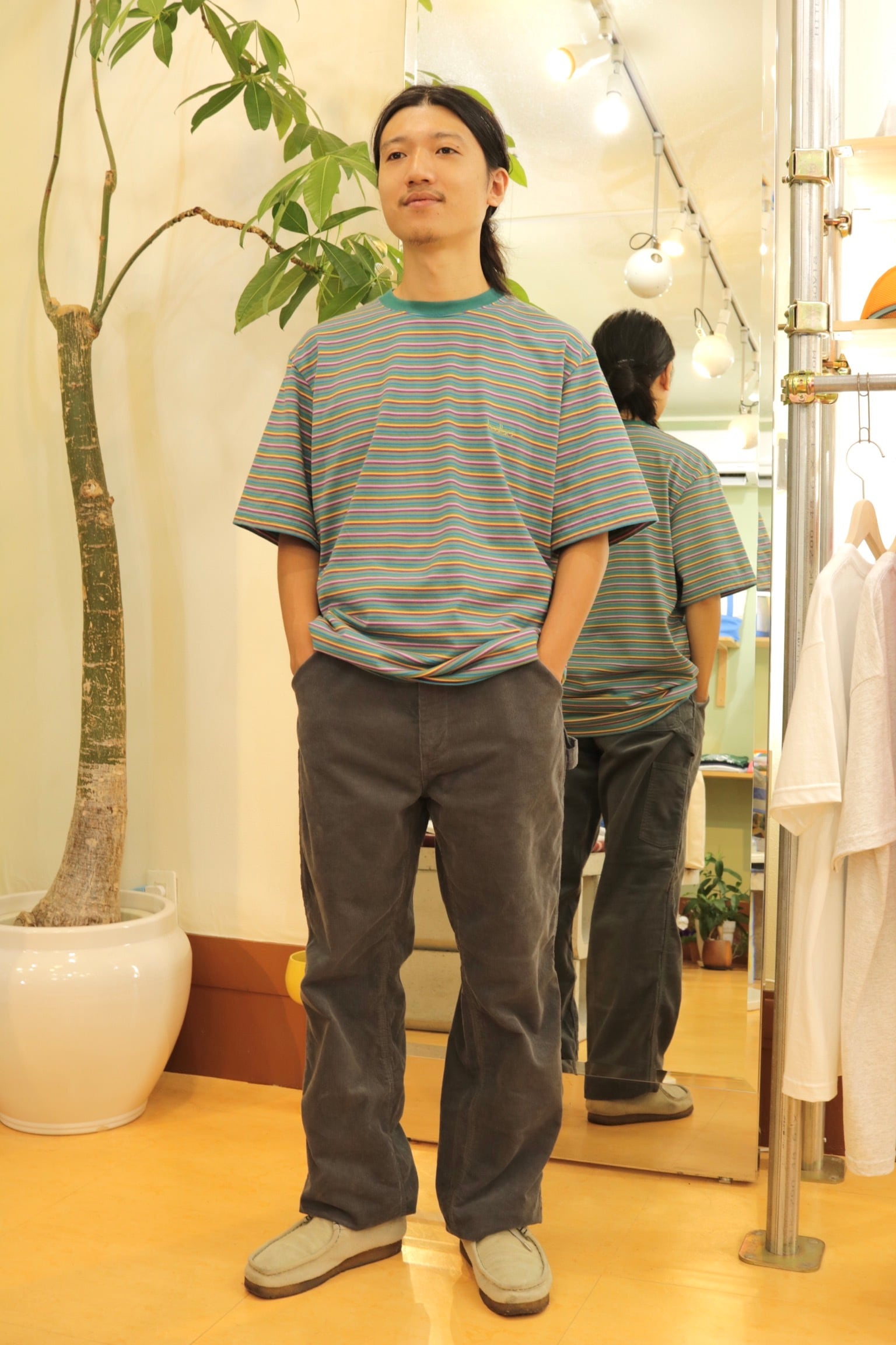 The T-shirt is made in Japan using a medium-thick heavyweight fabric that has been one-washed.